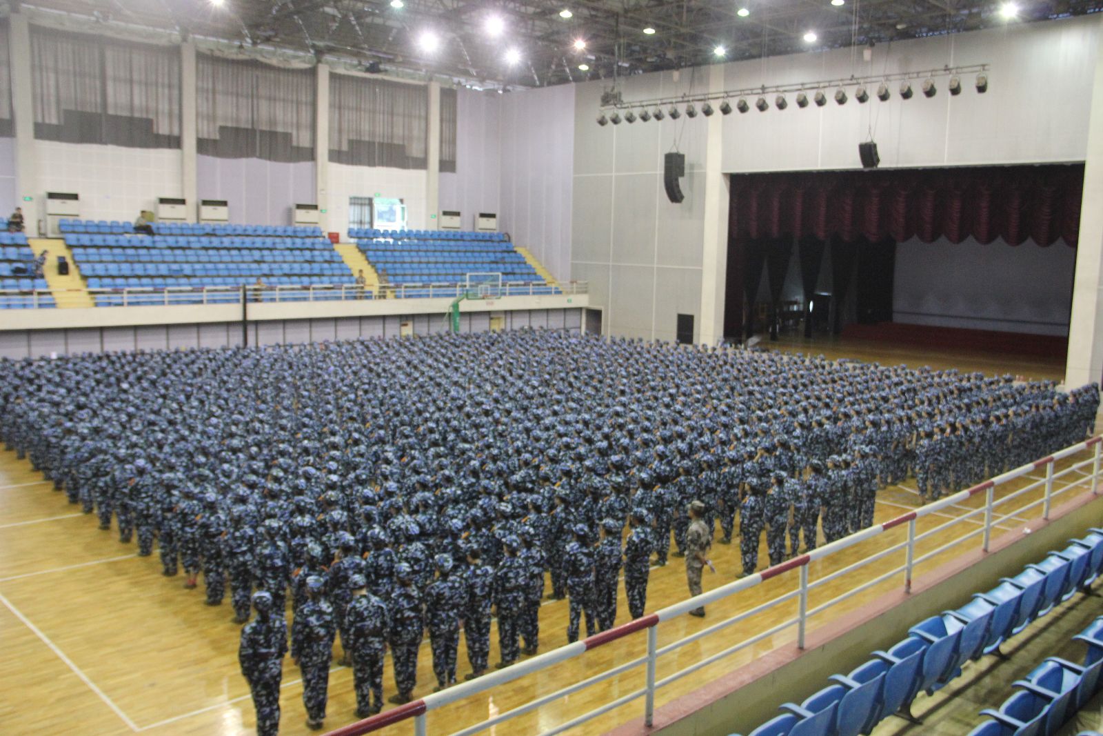 今天是2014年7月3日,也是军训的第四天。无法预测的天气,一改昨日的骄阳,又开始下起了零星小雨。然而,风雨依旧无法阻挡同学们前进的热情。体艺馆里,传来了队列操方阵的阵阵呐喊声、脚步声;教学楼里,分列式方阵的同学纷纷在楼道空地展开了训练,站军姿、齐步走、正步练习,同学们将自己的最饱满的热情投入到了训练之中。夜幕降临时,同学们抓紧时间赶到运动场,在夜空下展开了训练。明亮的灯光映照在同学们坚毅的脸庞之上,仿佛为同学们也镀上了一层金光。四天以来,无论风雨,同学们始终坚持如初。休息之余,教官和同学们唱起了歌,跳起了舞,夜中的校园里充斥着大家爽朗的笑声。