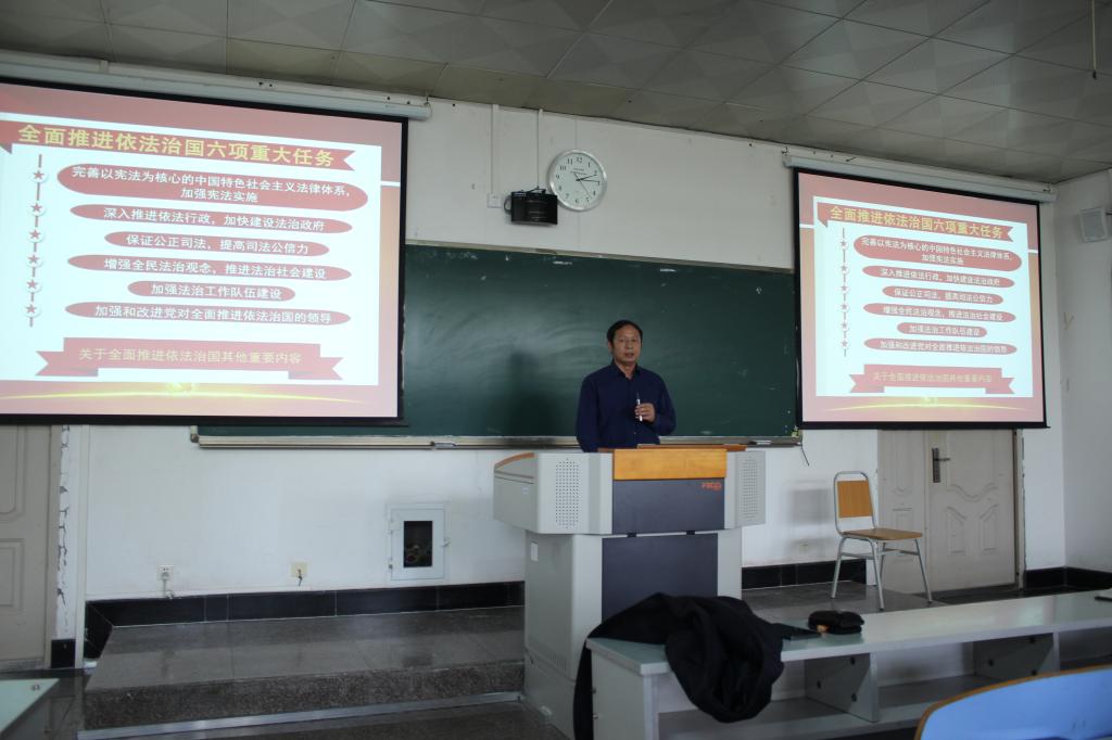 接下来,段书记介绍了刚刚闭幕的十八届四中全会的情况。十八届四中全会于2014年10月20日至23日在北京召开,会议审议通过了《中共中央关于全面推进依法治国若干重大问题的决定》,提出了全面依法治国的总目标和六项重大任务。在学习会上,段书记希望广大教职工主动学习党中央依法治国的精神,并把党中央的精神融入到自身的行动中。