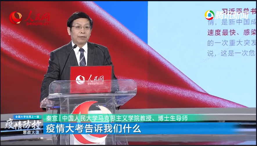 秦宣教授以《疫情大考告诉我们什么?》为题,解读了疫情以来,党和政府采取的坚决有力的防控措施,展现了出色的领导能力、应对能力、组织动员能力,党的领导和中国特色社会主义制度的优越性在快速及时、科学高效的大动员、大集结、大作战中得到充分展现。
