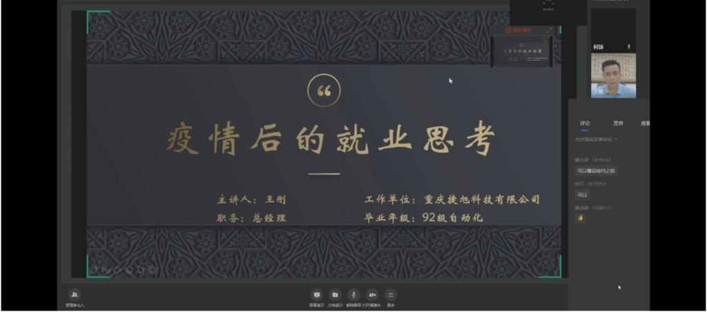为帮助员工进一步了解疫情影响下的就业环境、就业需求,增强员工个人职业规划能力,树立就业发展意识,6月19日学院特邀重庆捷旭科技有限公司总经理,院员工分会副会长,92级自动化专业员工王刚,通过企业微信为广大同学开展了一场深入的线上就业讲座。