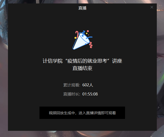 王刚员工主要从当前国际形势对中国的影响、中国经济形势对就业的影响、老员工应该秉持什么样的就业观(包含社会和用人单位的需求、就业城市和行业的选择等)、疫情下的就业机会、不同年龄阶段的发展任务等几个维度深刻地阐释了自己的观点和建议。一个半小时的讲座干货满满,同学们收获颇丰。最后,王刚员工耐心细致的解答了同学们在学业和职业生涯规划中遇到的困惑,为整场就业交流讲座划上了圆满句号。本次活动吸引了共600余人次的观看,受到了同学们的一致好评。