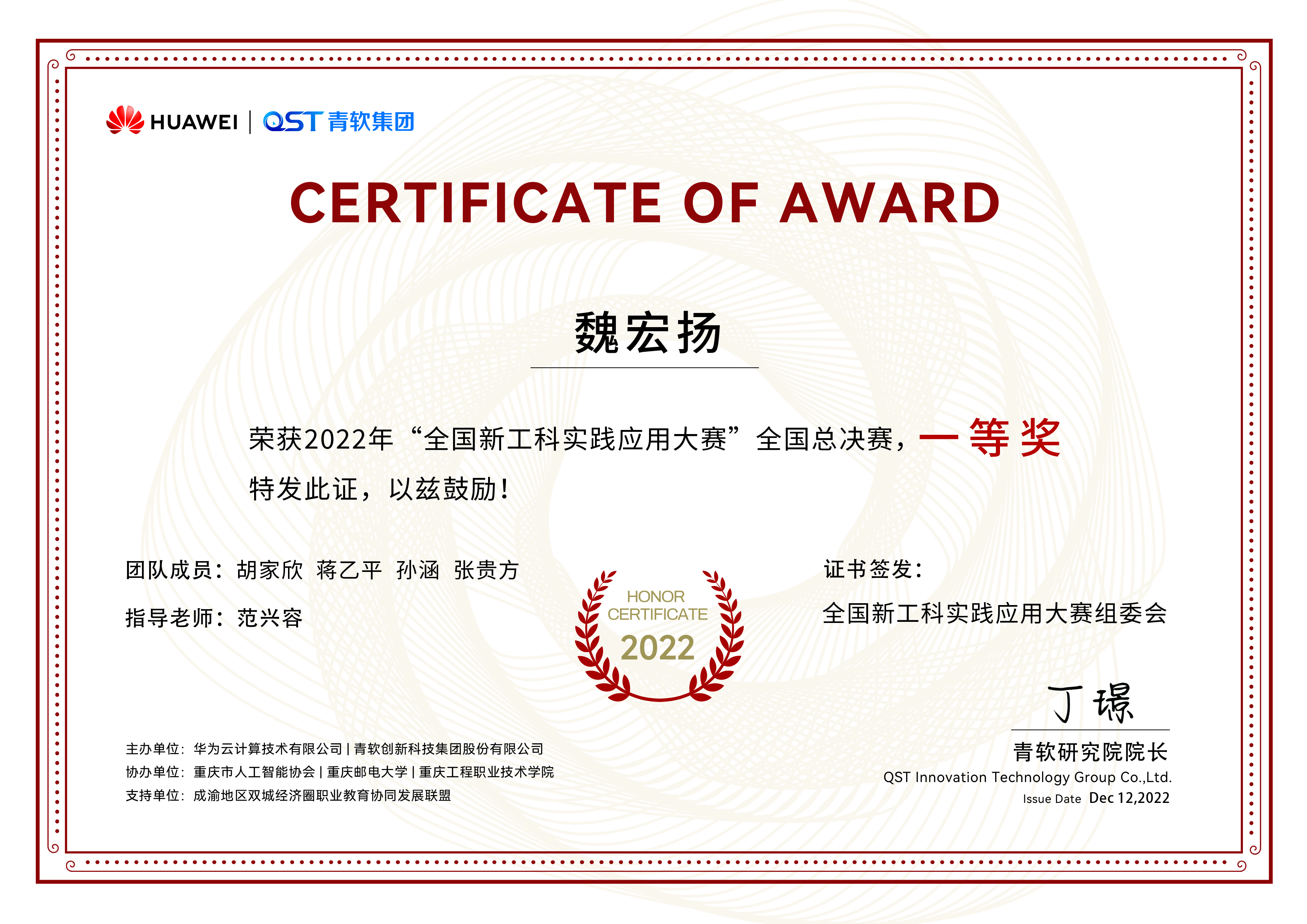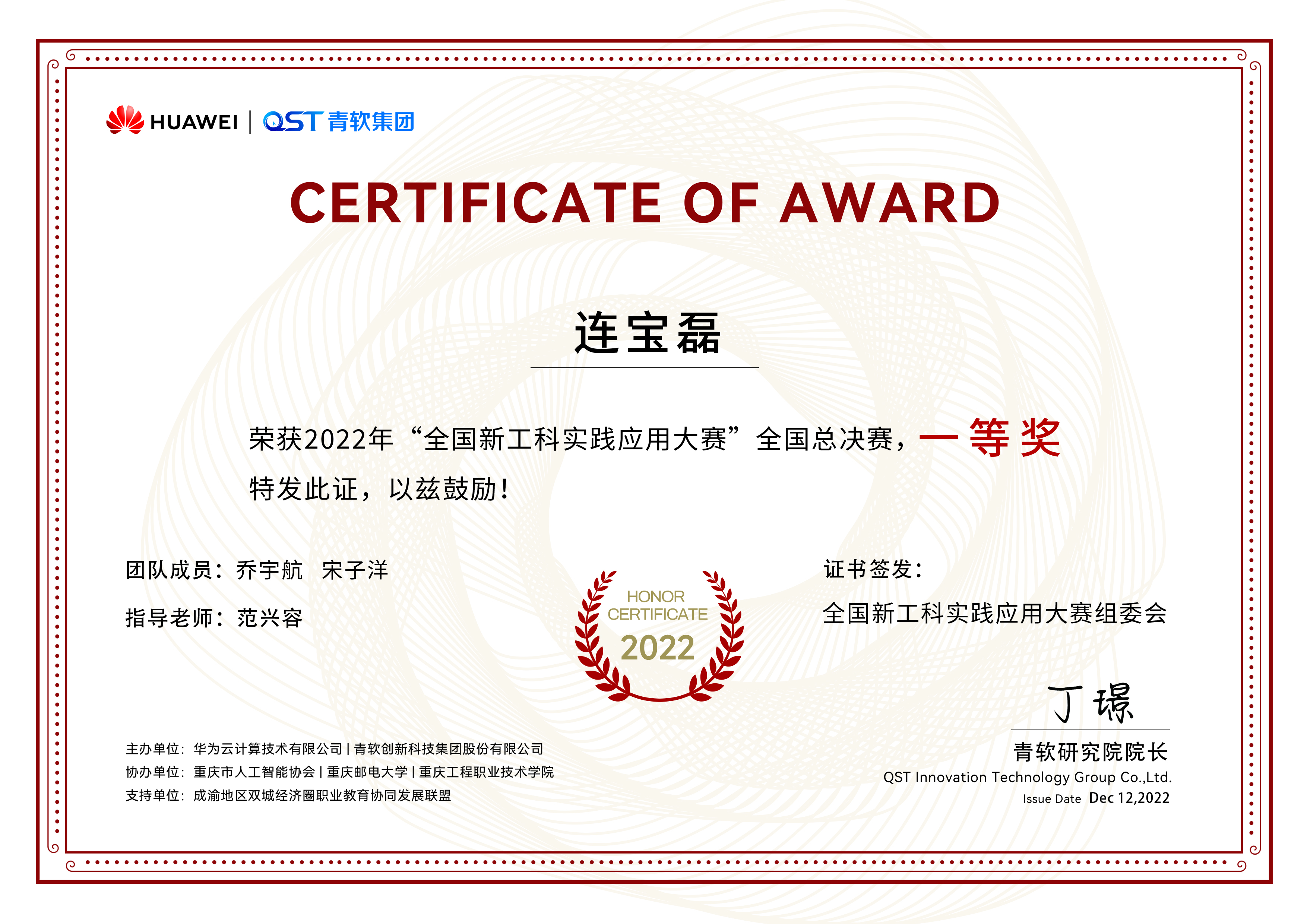 2022年11月21-30日,华为云2022年全国新工科实践应用大赛全国总决赛在云端如期举行。 数百支来自全国各大高校的参赛队伍在线上展开⻆逐,经过激烈的切磋比拼与专家评审,公司 yh533388银河学子在AR科创团队指导教师范兴容博士指导下获得全国一等奖2项的好成绩。