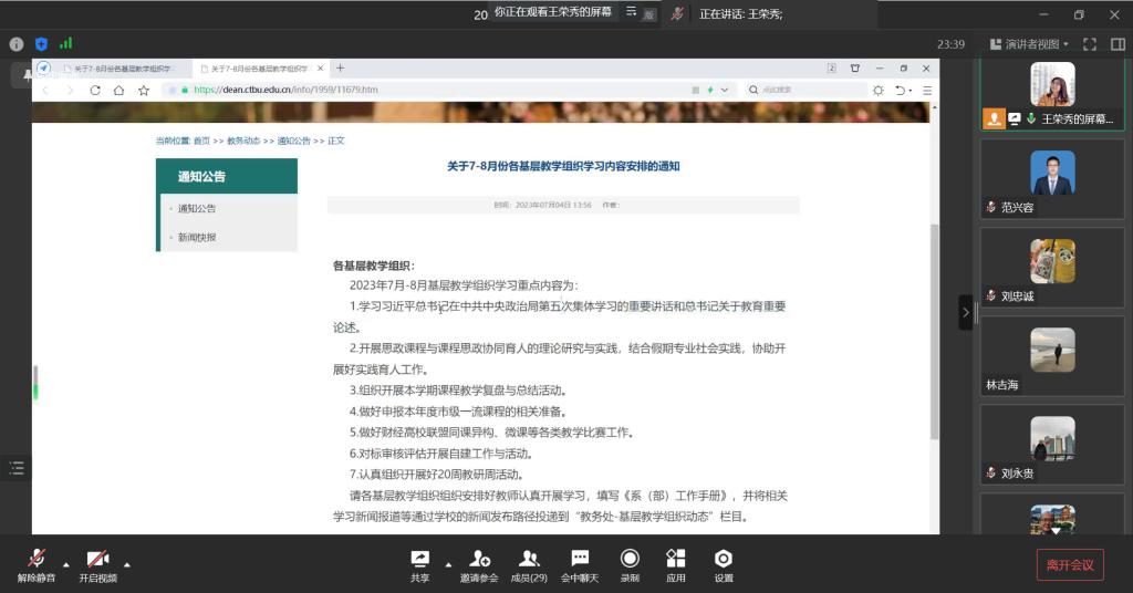 会议的第二个议程是王主任和范主任分别就暑假期间各项工作做了讲解和布置。王主任组织学习了习近平总书记在中共中央政治局第五次集体学习的重要讲话和总书记关于教育重要论述;布置了重庆市高校微课比赛;一流课程申报;课程思政建设精彩案例申报;课程思政示范项目申报等一系列需要在9月初提交的项目;汇报了测控和自动化专业最新就业率,希望各帮扶教师在8月31日之前再推一波,争取能将测控就业率提升到与去年的90%持平。范兴容主任也就自动化课程思政示范专业申报,AB级中文期刊认定,横向项目结题和近期正在进行了的2024年预算申报等工作给老师做了详细汇报,希望老师们在2024年围绕教育教研,实践教学,竞赛等开展工作,取得更大的成绩。