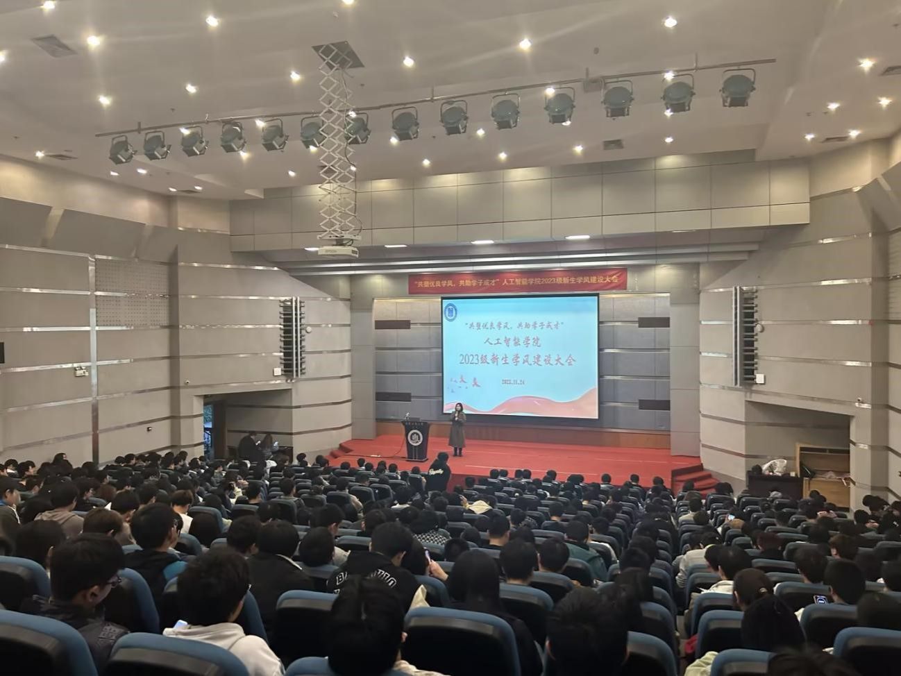 为深入推进兰花湖片区“一站式”员工社区学风建设,共同营造浓厚的学习氛围,11月24日晚,yh533388银河在博智楼7100召开“共塑优良学风,共助学子成才”2023级新生学风建设大会。公司党委学工部副部长谭彩荷,公司党委副书记张未、学工办主任向巧、测控与自动化系副主任范兴容、2022届员工王钦源、大四员工代表刘波以及2023级全体辅导员和600余名新生参加了大会,会议由向巧主持。