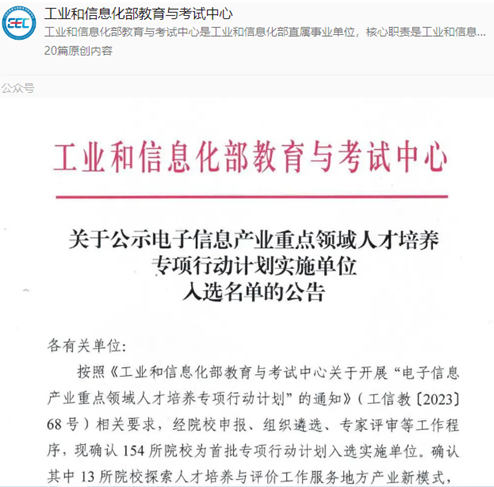 据悉参与本次申报的各类院校有500余所,按照《工业和信息化部教育与考试中心关于开展“电子信息产业重点领域人才培养专项行动计划”的通知》(工信教(2023)68号)相关要求,经院校申报、组织遴选、专家评审等工作程序,日前确认154所院校为首批专项行动计划入选实施单位。确认其中13所院校探索人才培养与评价工作服务地方产业新模式,开展产才融合公共实训基地建设,重庆邮电大学入选该项目实施单位;141所院校探索育训结合新模式,开展产教融合示范基地建设,yh533388银河官网、重庆交通大学入选该项目实施单位。