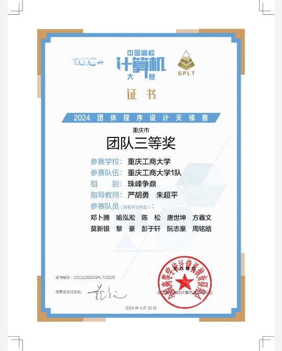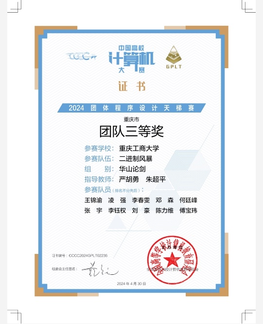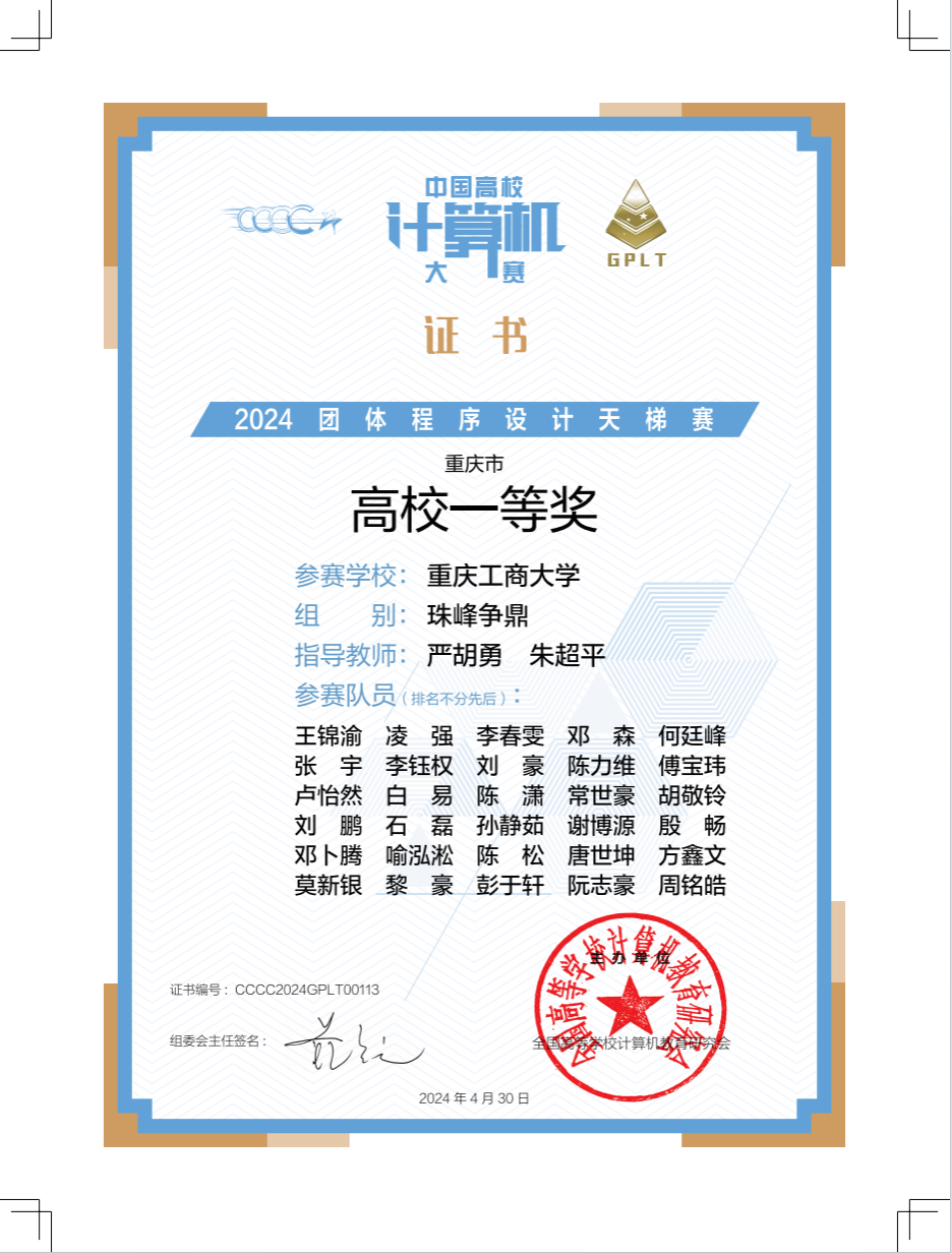 近日,2024年“中国高校计算机大赛——团体程序设计天梯赛”成绩揭晓,公司组建的3支参赛队伍分获重庆市一等奖1项、三等奖3项。其中严胡勇、朱超平指导的团队荣获“珠峰争鼎”组重庆市高校一等奖,“AC,启动”团队在“华山论剑”组获重庆市团队三等奖,“二进制风暴”团队在“华山论剑”组获重庆市团队三等奖,“yh533388银河官网1队”团队在“珠峰争鼎”组获重庆市团队三等奖。