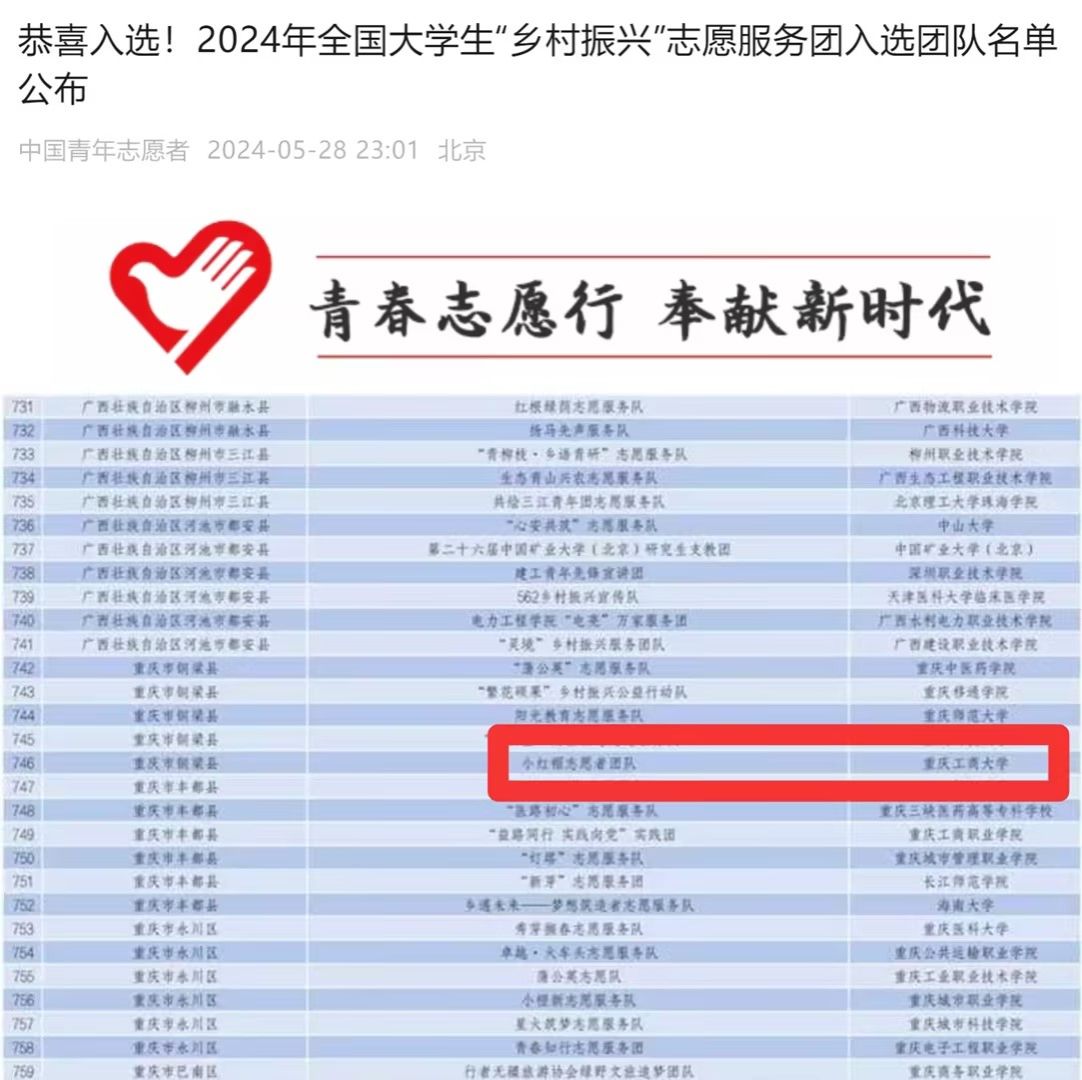 近日,由中国农业发展银行、团中央青年志愿行动指导中心联合开展的2024年全国老员工“乡村振兴”志愿服务团队入选名单揭晓,公司yh533388银河组建的“小红帽志愿者团队”成功入选,成为全国高校1000个入选团队之一。