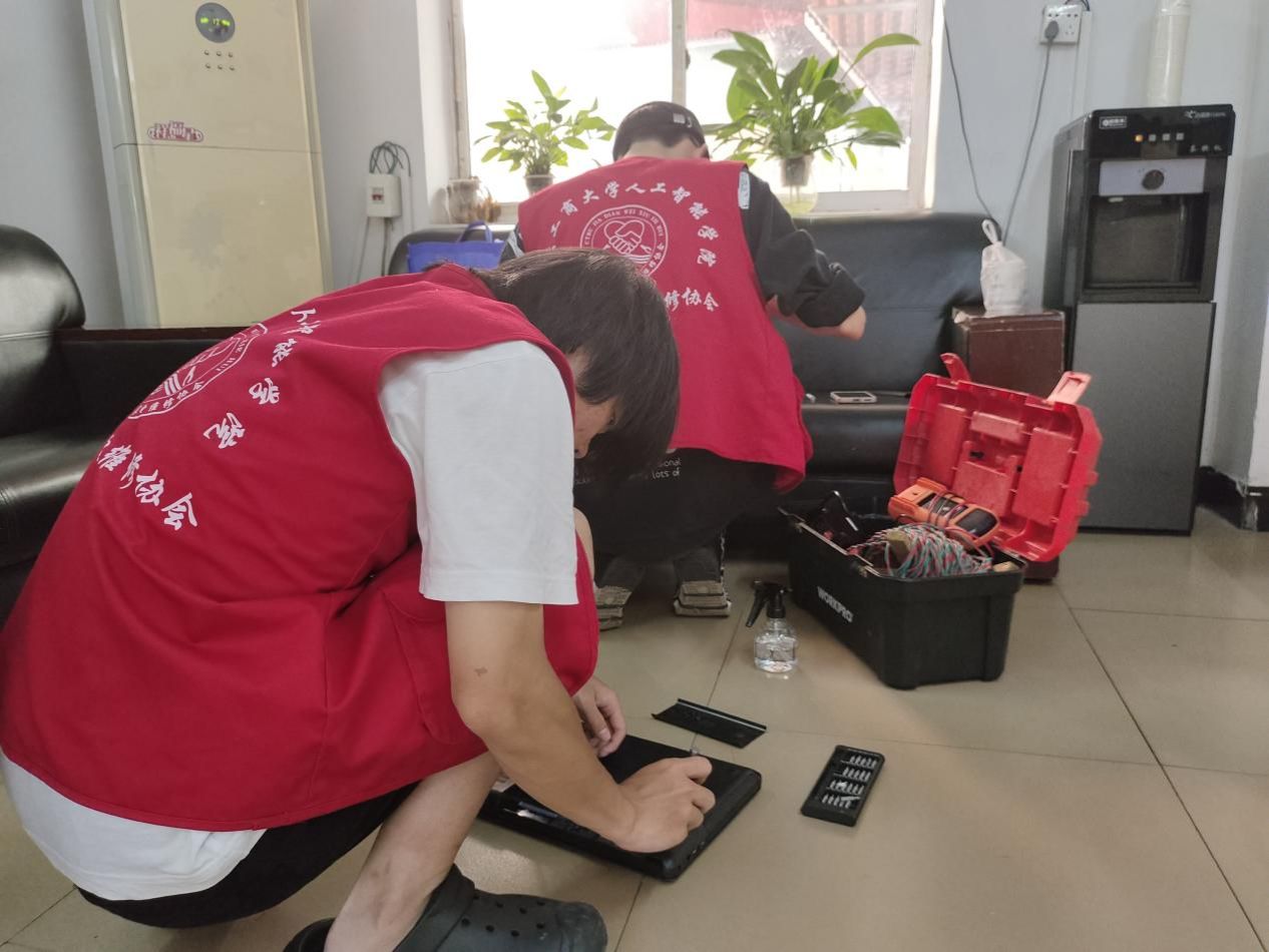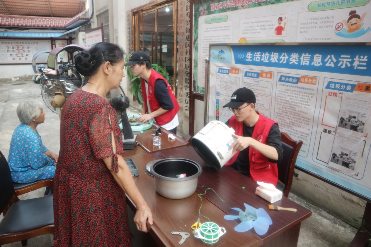 7月17日,团队走进华兴镇惠民社区开展集中义务维修。在当地工作人员的大力支持和广泛宣传下,前来送修的居民络绎不绝。有了前期走访入户经验,团队更了解当地居民怀旧小家电集中的品类和维修痛点,集中义修的配件准备更加充分、故障摸排更加精准高效,大大提高了维修的成功率。此外,实践团还耐心细致的为村民们普及了家电养护小知识,为他们进行简单的维修技术培训,尽力帮助乡亲们打通家电维修最后一公里。